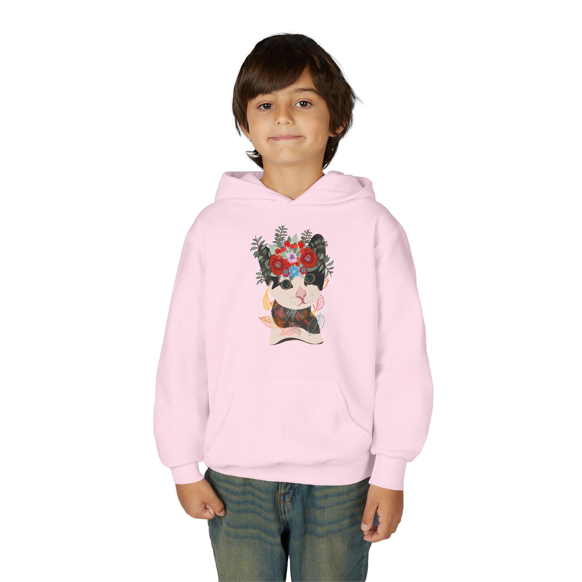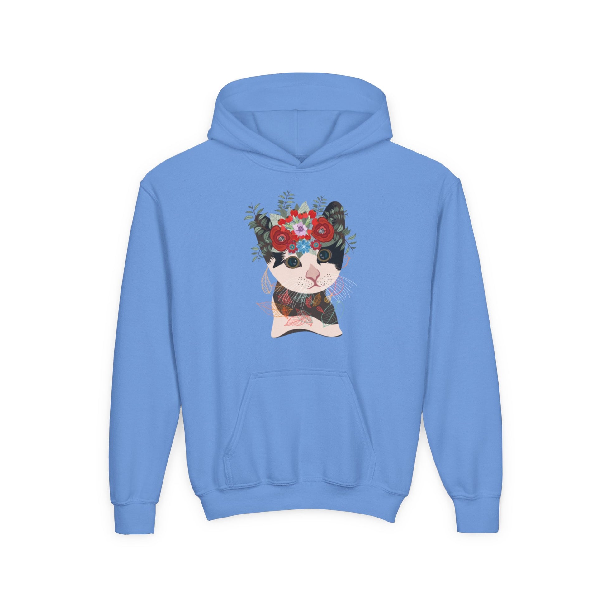 Youth Heavy Blend Hooded Sweatshirt - Lovely cat with crown flower