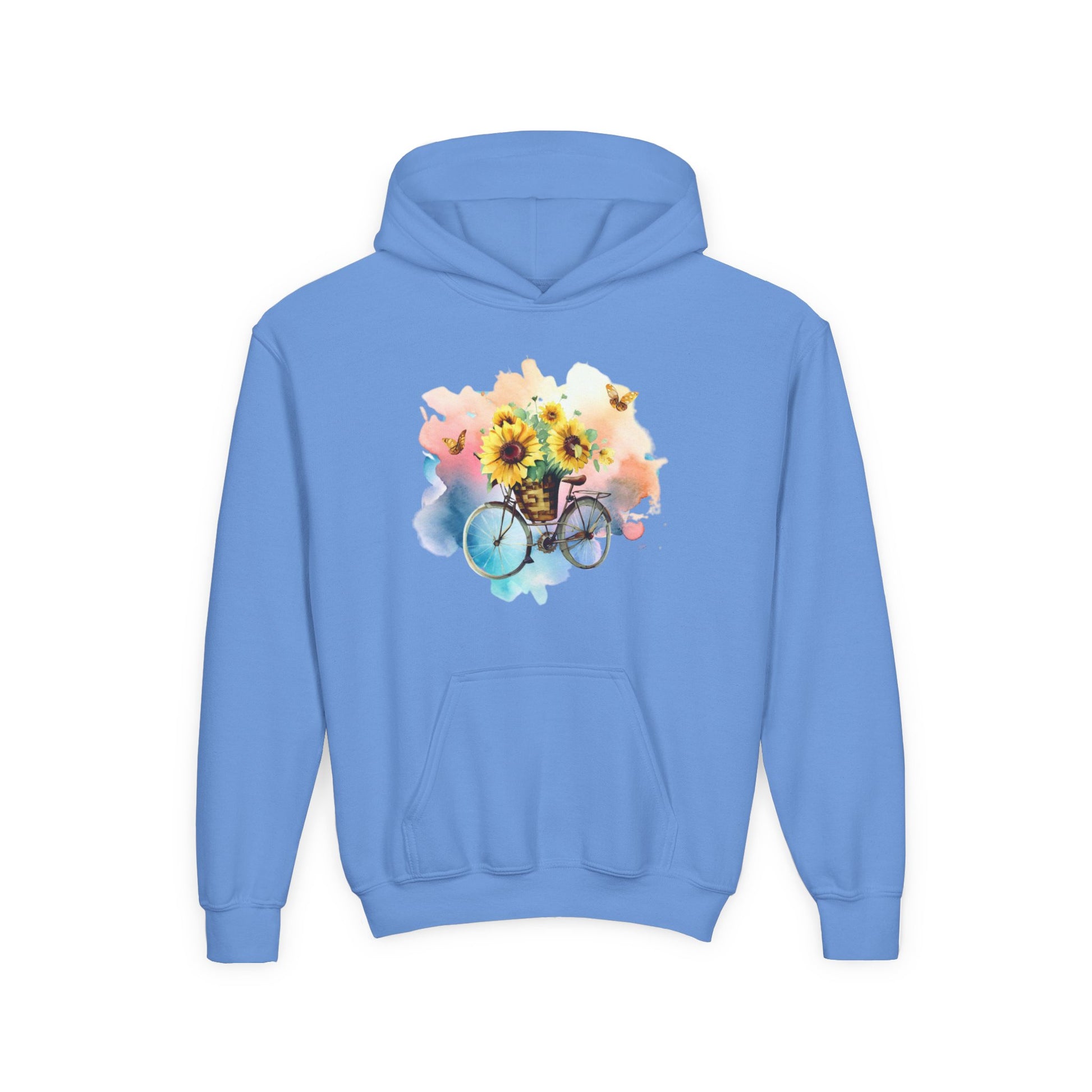 Embrace the warmth and comfort of this Youth Heavy Blend Hooded Sweatshirt, perfect for those chilly days. Adorned with a charming design featuring vibrant sunflowers on a bicycle, this sweatshirt radiates joy and a love for adventure. It’s an ideal choice for kids and teenagers who enjoy expressing their personality through unique fashion. Whether it’s a day at the park, a family outing, or simply lounging at home, this cozy hoodie fits seamlessly into a young person’s life. It's also perfect for celebrations like birthdays or seasonal holidays, making gift-giving effortless during festive occasions. The sweatshirt combines practicality with style, ensuring that your little one stays warm while showcasing their playful spirit.