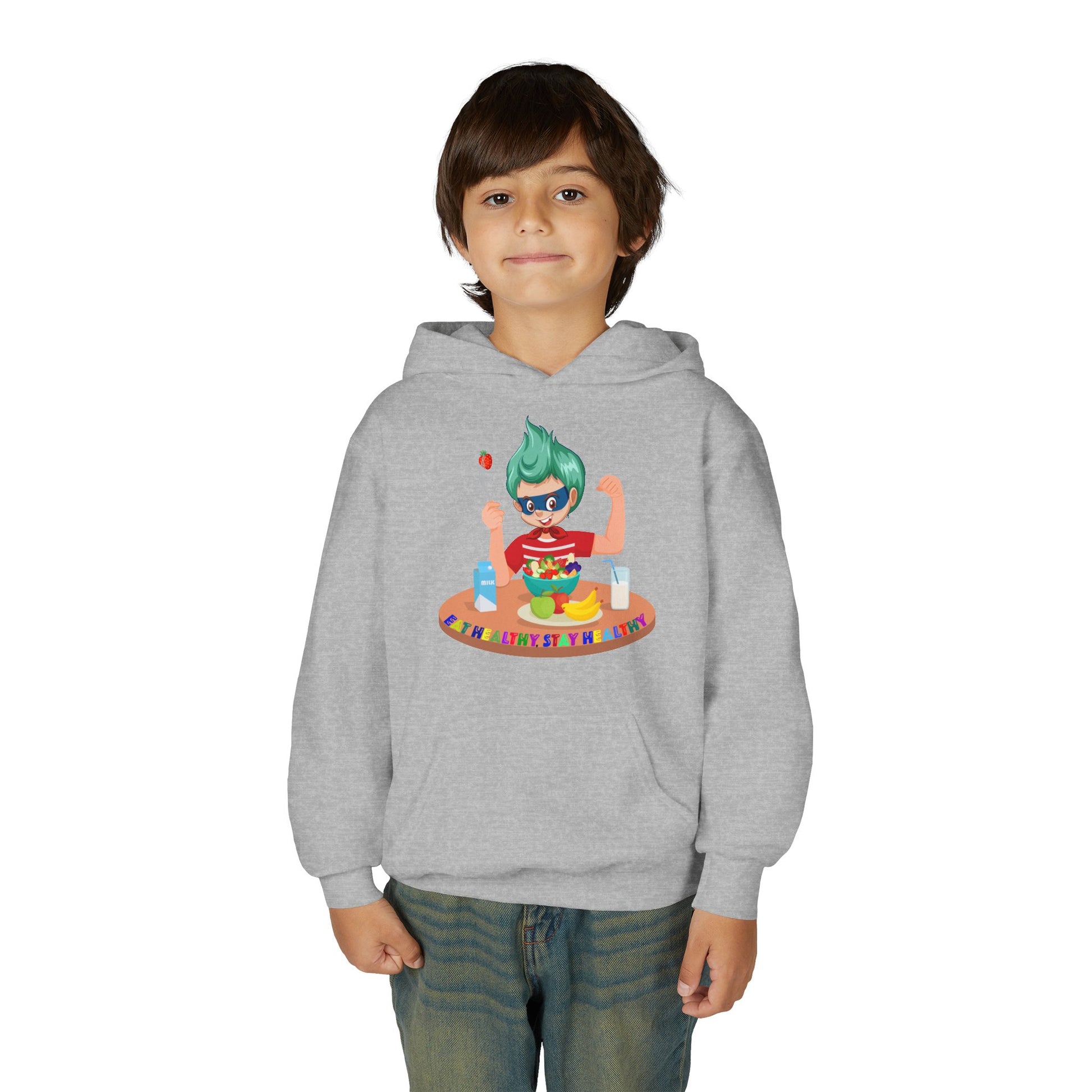 Youth Heavy Blend Hooded Sweatshirt - super kiddo eating healthy food