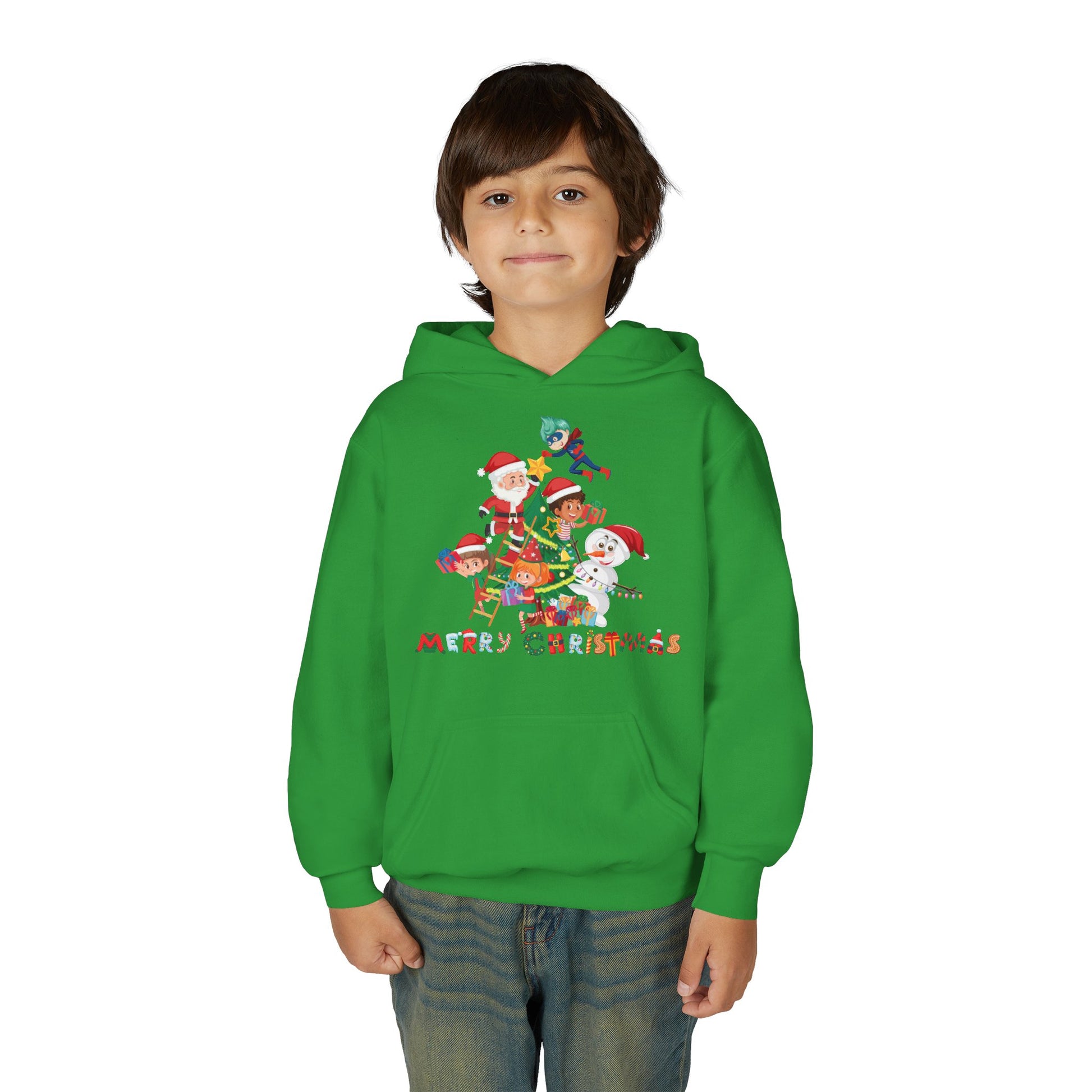 Youth Heavy Blend Hooded Sweatshirt - Super kiddo making christmas tree with text