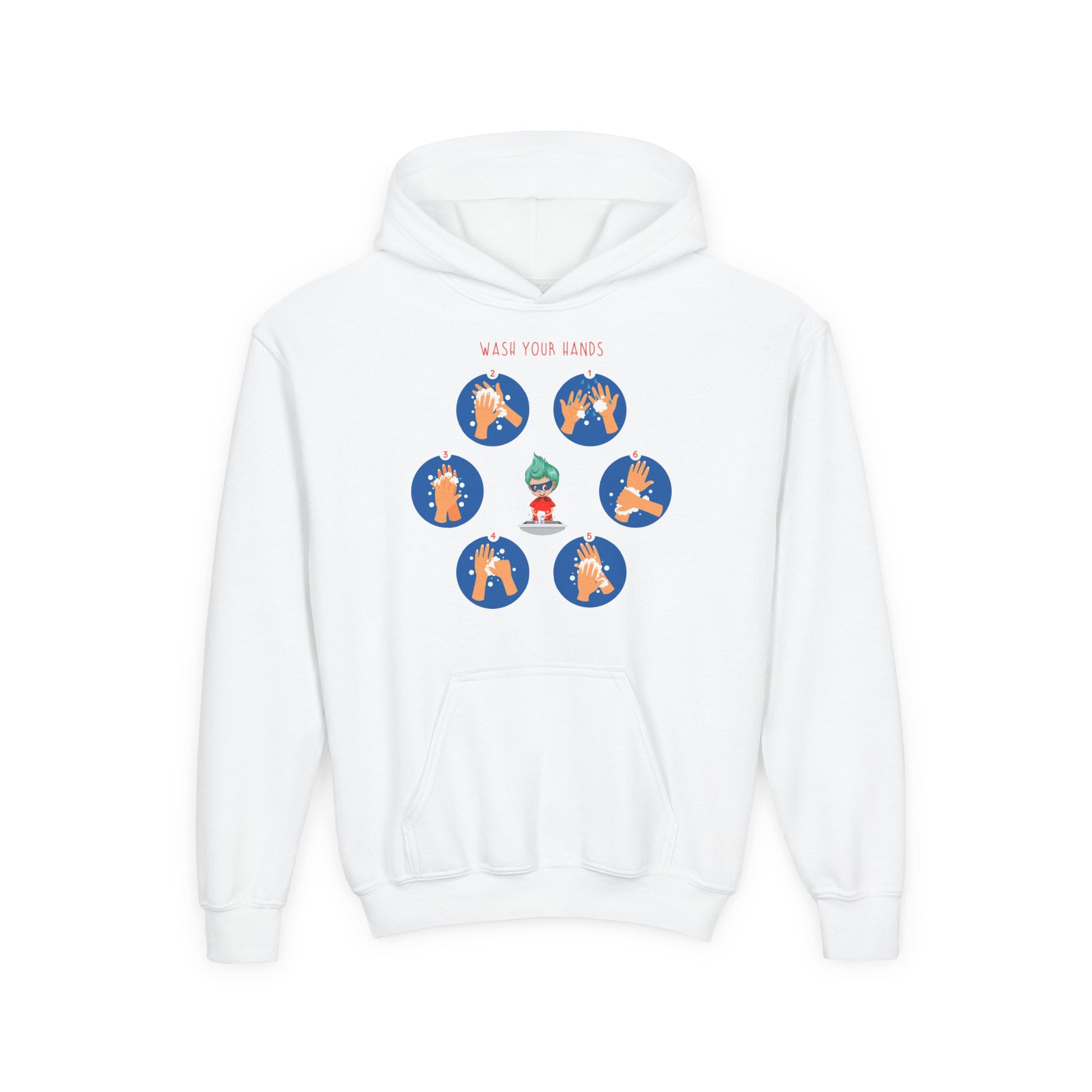 Youth Heavy Blend Hooded Sweatshirt - Super kiddo teaching how to wash hands