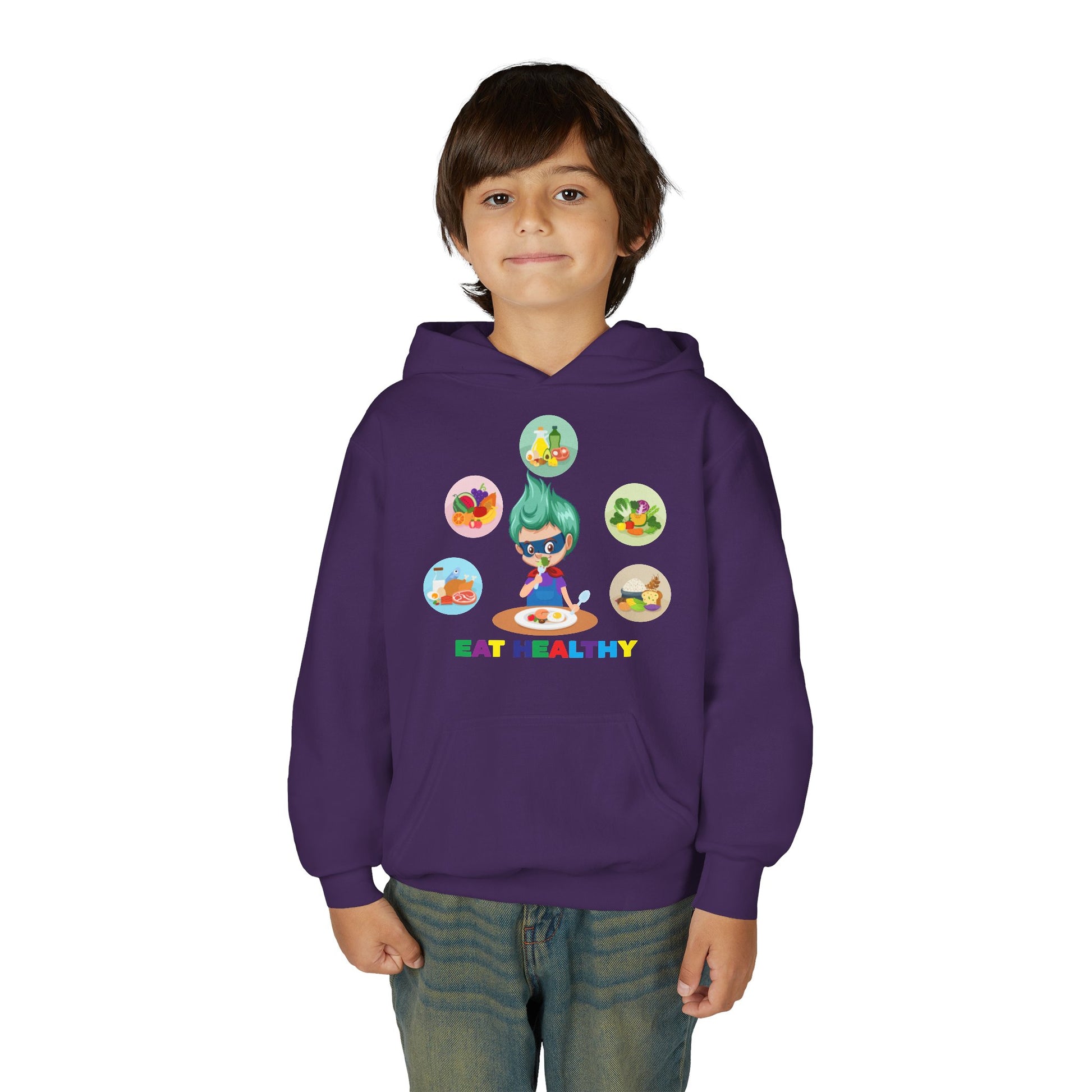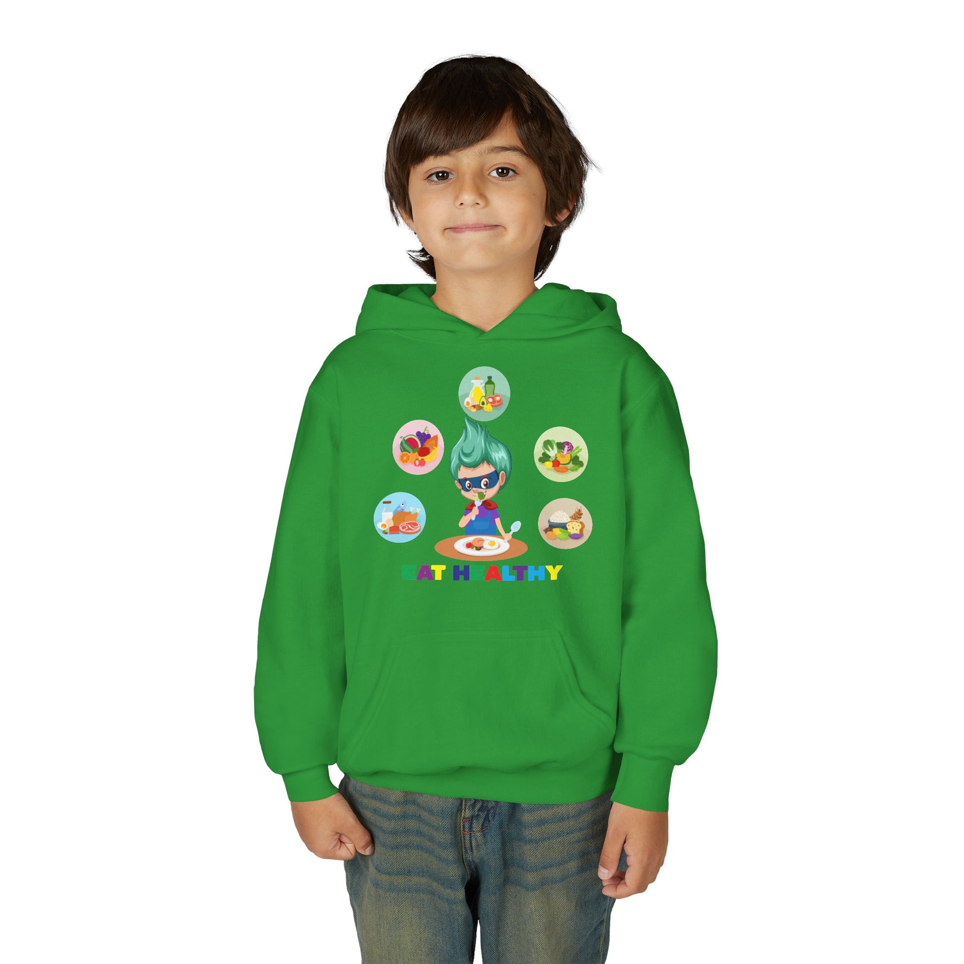 Youth Heavy Blend Hooded Sweatshirt - Supper kiddo showing healthy food to eat