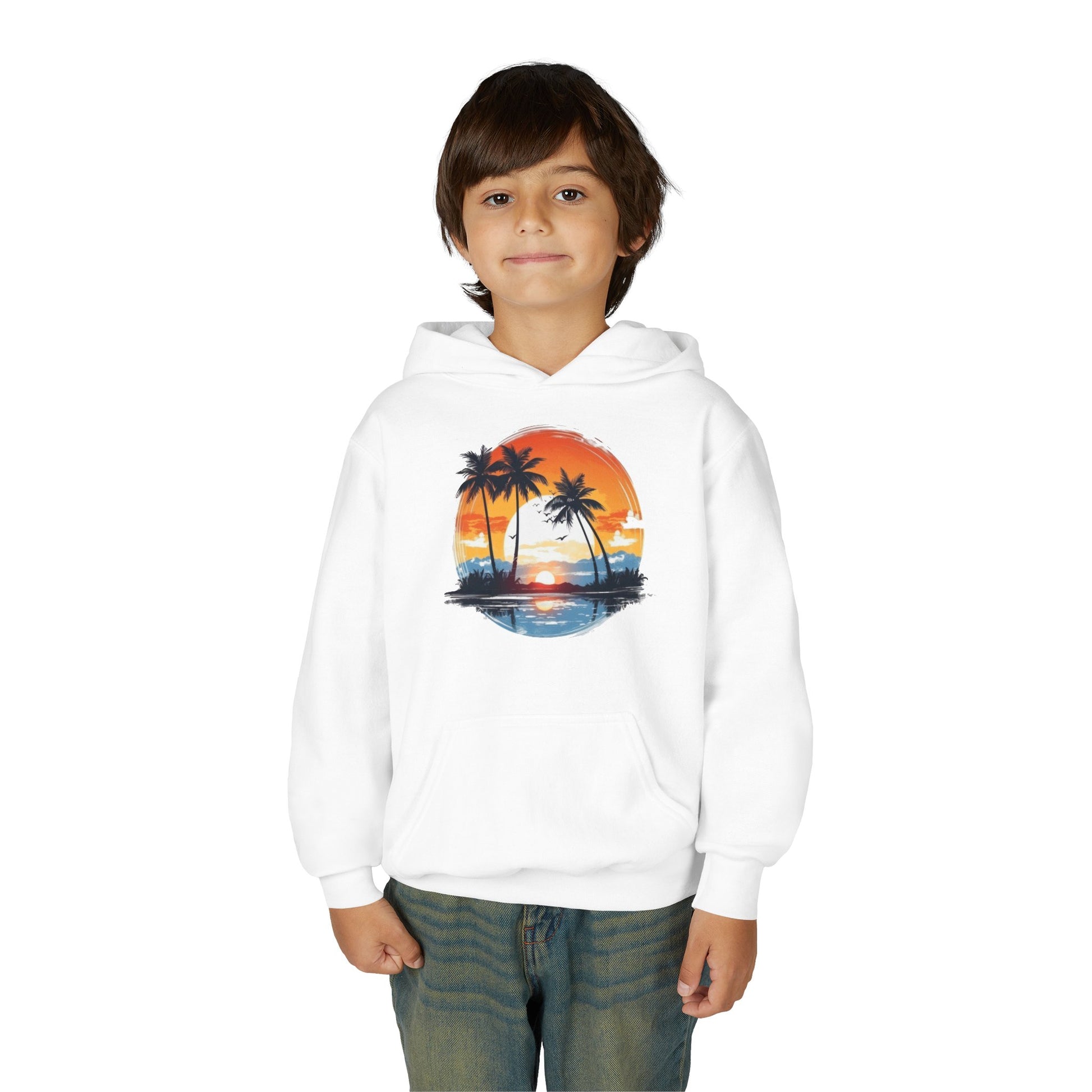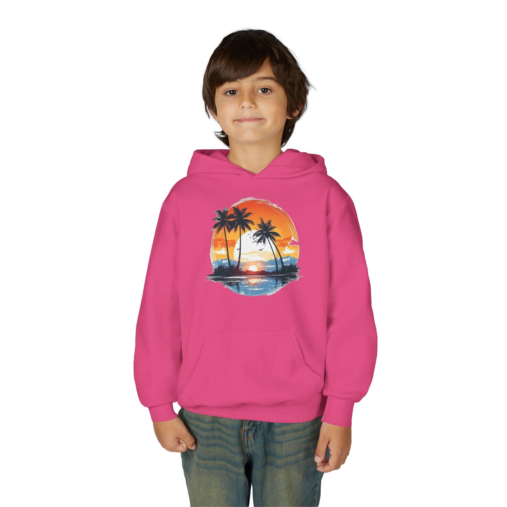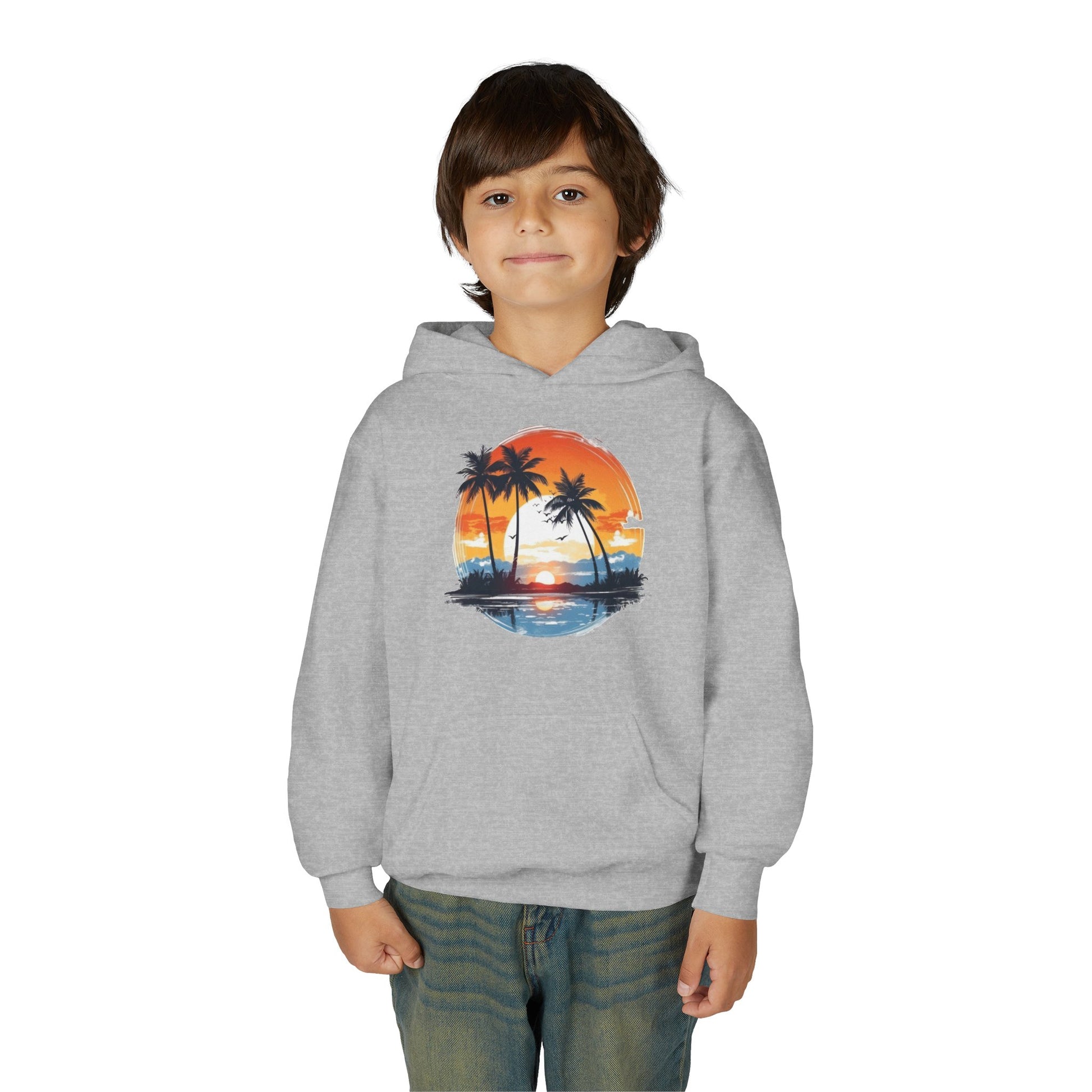 Embrace comfort and style with this Youth Heavy Blend Hooded Sweatshirt, perfect for any youthful adventurer. Featuring a vibrant sunset and palm tree design, it embodies a laid-back, tropical vibe that kids will love. The sweatshirt is made for everyday wear, whether lounging at home or enjoying outings with friends. Ideal for school, playdates, or holiday gatherings, it becomes a staple in any child’s wardrobe. Great for gifting on occasions such as birthdays, holidays, or even back-to-school season, this piece is a must-have for fashion-forward youngsters.