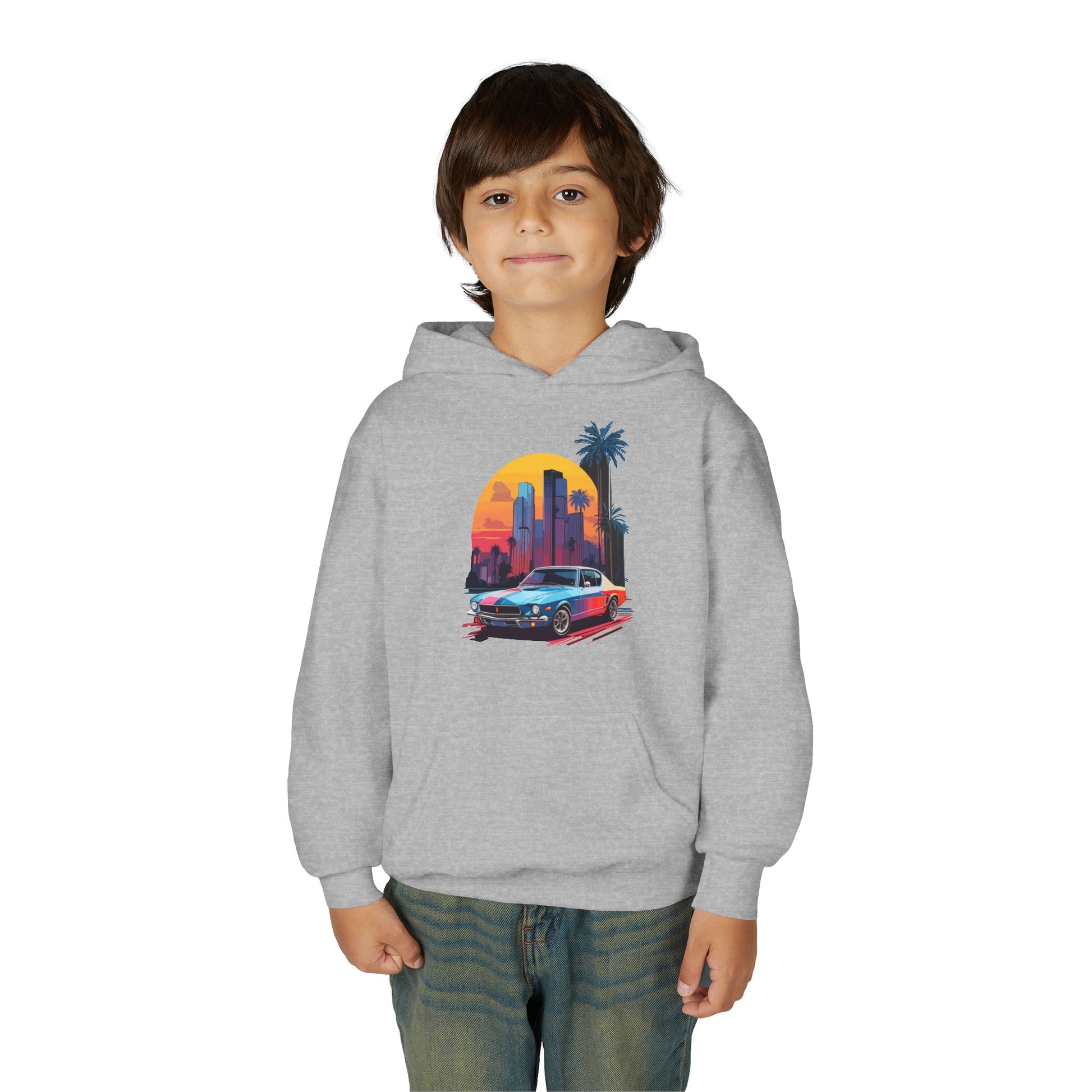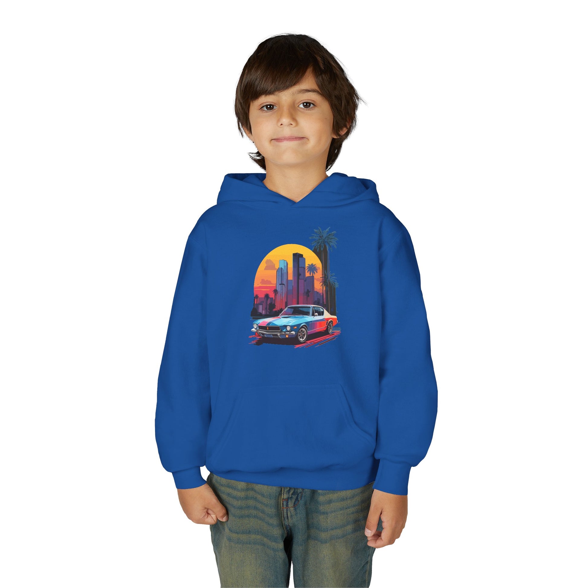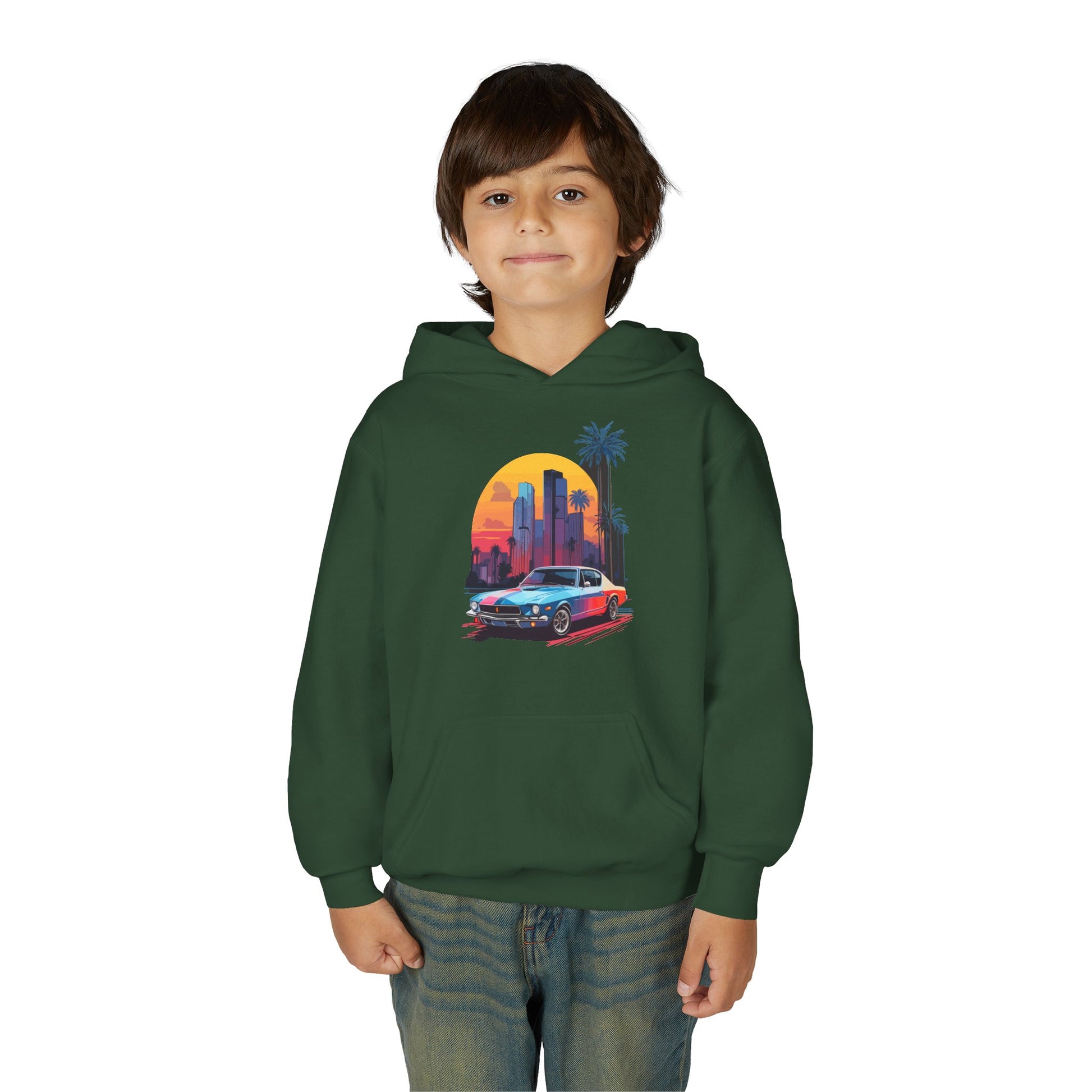 Introducing the perfect companion for those chilly days and casual outings: this Youth Heavy Blend Hooded Sweatshirt is designed to provide warmth and comfort without sacrificing style. With its soft cotton-polyester blend, this sweatshirt feels cozy against the skin, making it an essential piece for every young adventurer. Whether lounging at home, playing in the park, or hanging out with friends, this sweatshirt adds a touch of laid-back cool to any outfit. It's ideal for kids ages 5-16, making it a great gift for birthdays, holidays, or back-to-school occasions! The vibrant design captures a sense of adventure and nostalgia, perfect for enthusiasts of classic cars and city skylines. Celebrate life's moments in style, and let your little ones express their unique personalities with this charming sweatshirt.
