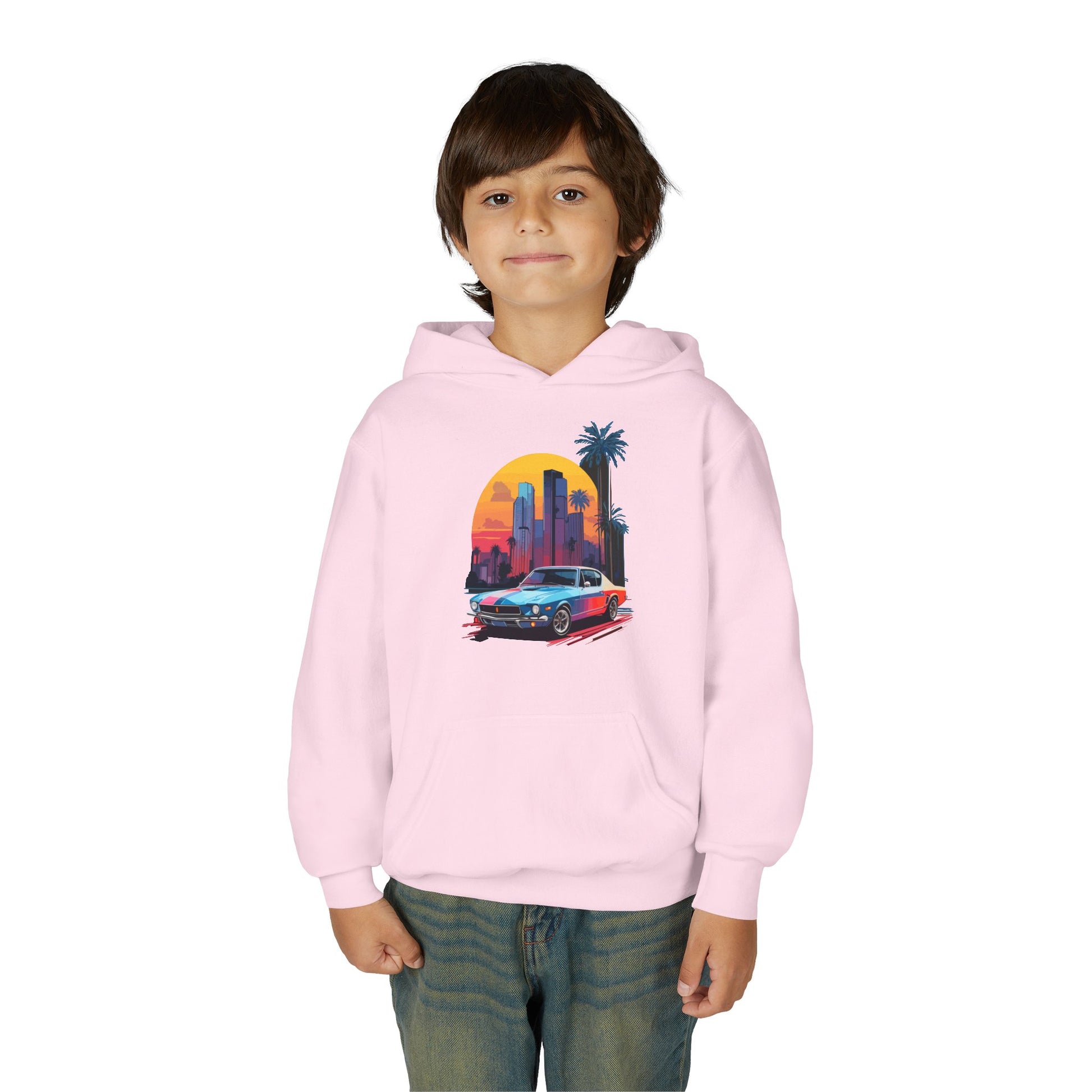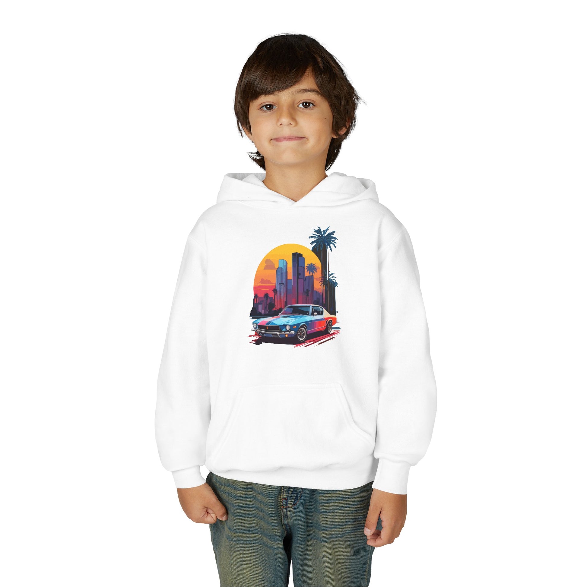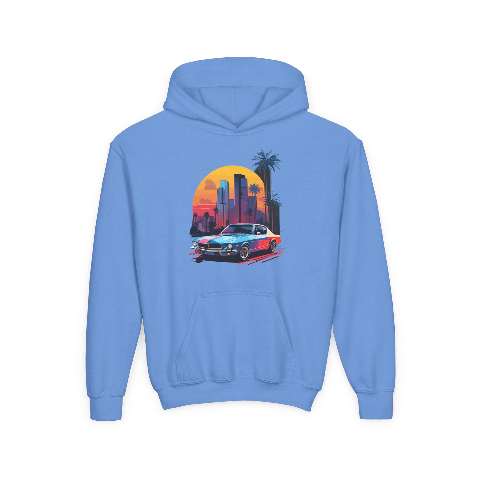 Introducing the perfect companion for those chilly days and casual outings: this Youth Heavy Blend Hooded Sweatshirt is designed to provide warmth and comfort without sacrificing style. With its soft cotton-polyester blend, this sweatshirt feels cozy against the skin, making it an essential piece for every young adventurer. Whether lounging at home, playing in the park, or hanging out with friends, this sweatshirt adds a touch of laid-back cool to any outfit. It's ideal for kids ages 5-16, making it a great gift for birthdays, holidays, or back-to-school occasions! The vibrant design captures a sense of adventure and nostalgia, perfect for enthusiasts of classic cars and city skylines. Celebrate life's moments in style, and let your little ones express their unique personalities with this charming sweatshirt.