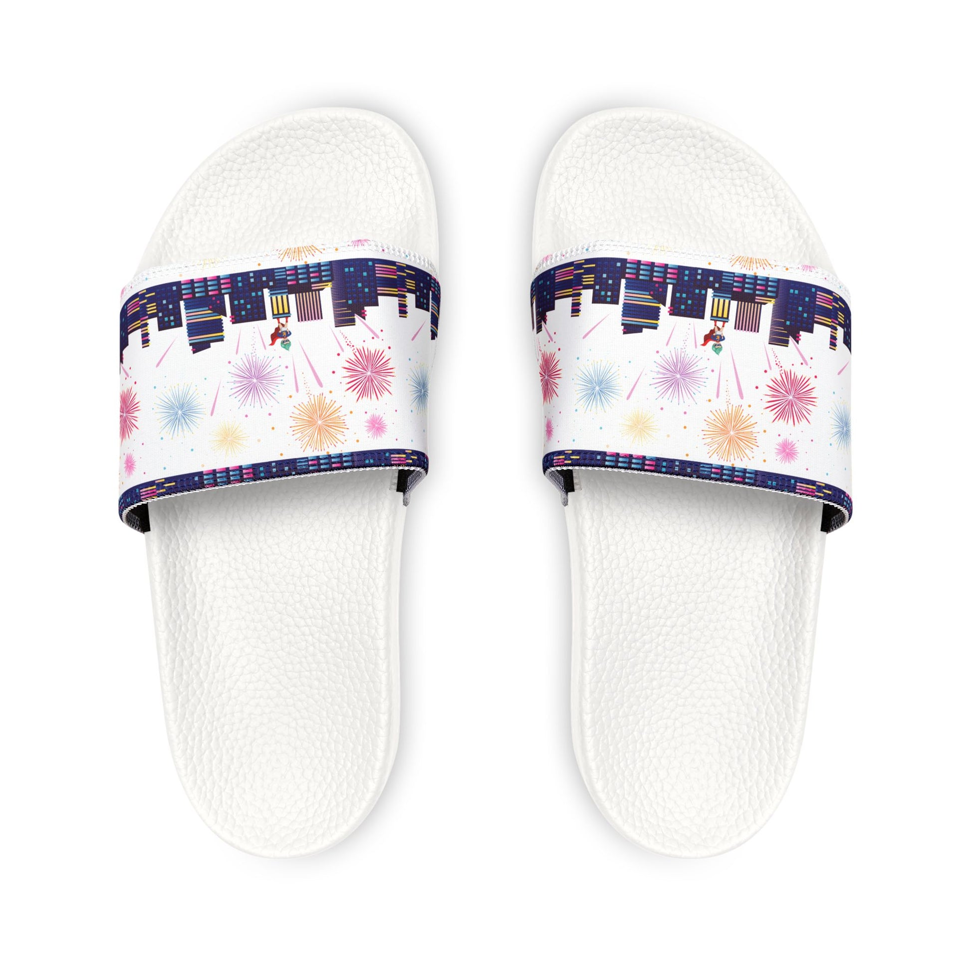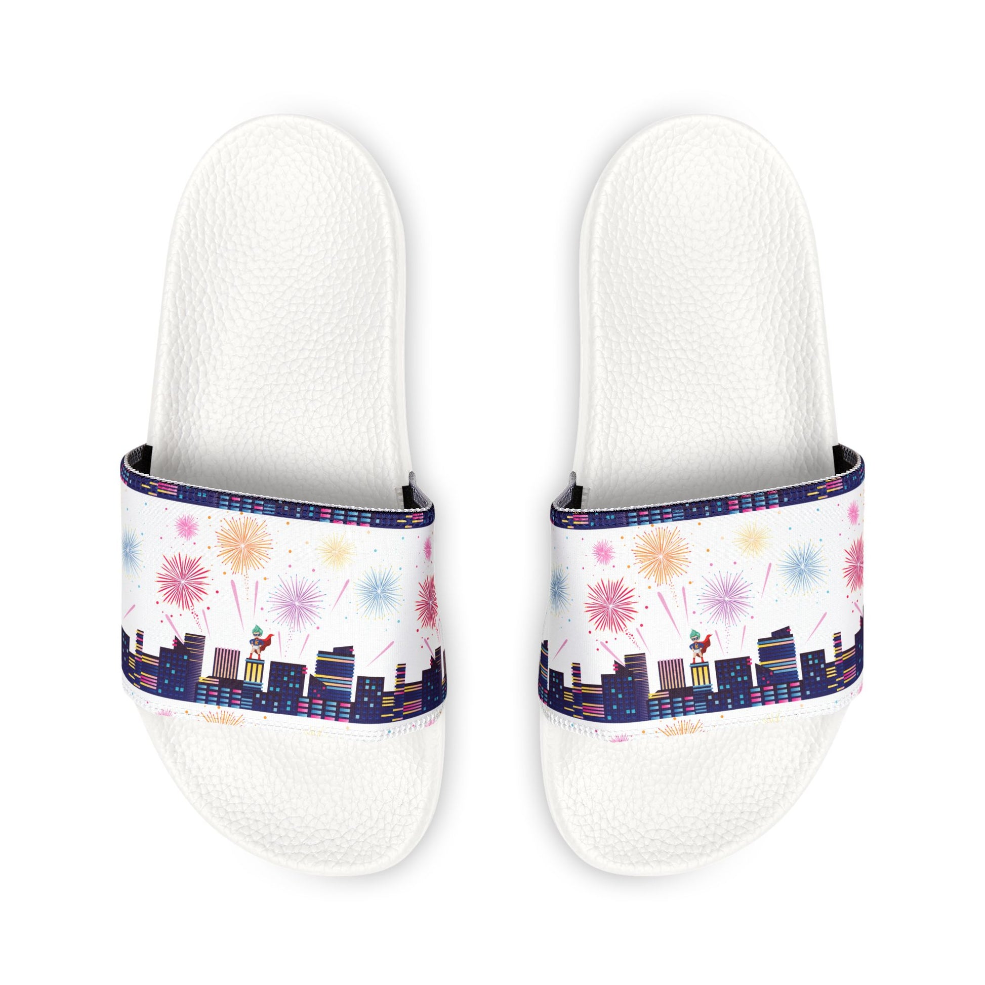 These youth removable-strap sandals bring playful customization to easy, everyday wear. Lightweight PU-foamed soles contour to the foot for cushioned support, while an embossed insole helps keep small feet steady during long days of play. The wide strap snaps on and off so kids can switch between printed and plain looks in seconds — bright cityscape-and-fireworks prints shown, plus solid options for calmer days. Quick-drying polyester/neoprene straps and durable polyurethane outsoles stand up to puddles, pool decks, and sticky playground afternoons. Simple, comfortable, and built to move with growing kids, these sandals tuck neatly into backpacks and double as an at-home slip-on and a summer staple for neighborhood adventures.